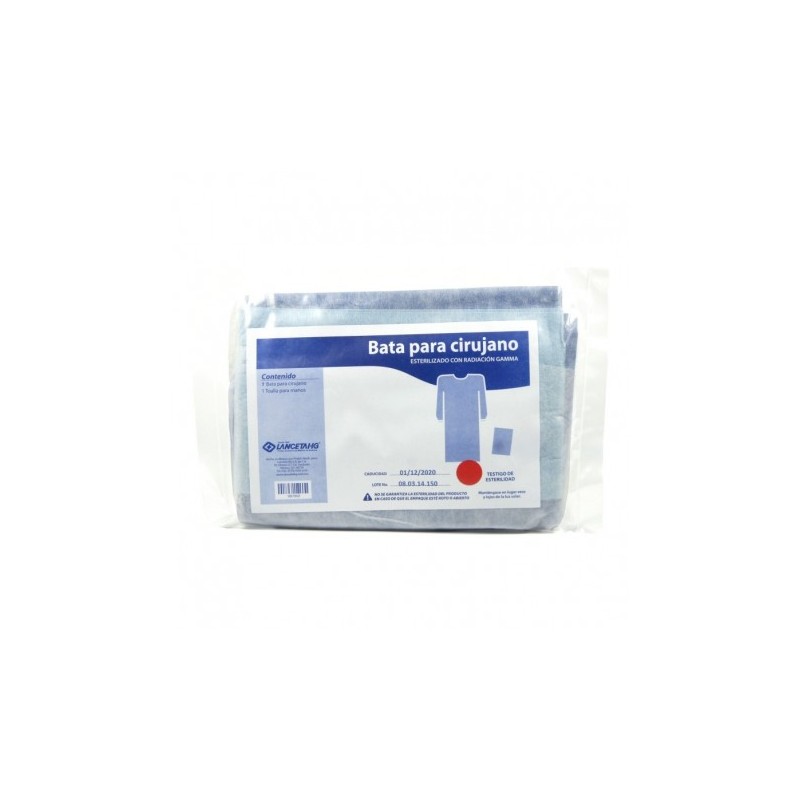 Fabricado con tela SMS. Esterilizado con radiación gamma. Contiene: 1 bata para cirujano unitalla. 1 toalla para manos de 27 x 30 cm