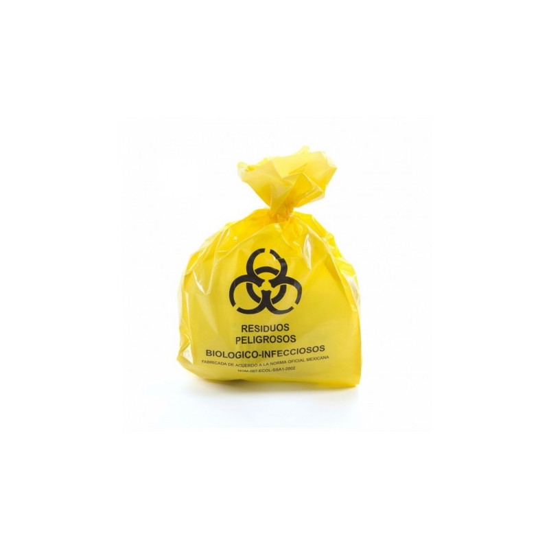 Bolsa de polietileno color amarillo traslúcido, impermeable, marcada con leyenda "Residuos peligrosos Biológico-Infecciosos" y con el símbolo universal de "Riesgo Biológico".