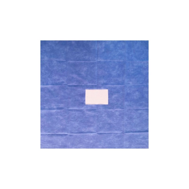 Campo quirúrgico de tela SMS de 35 gramos. Color antireflejante. No transparente. Antiestática. Resistente a la tensión. Con adhesivo de un lado. Esterilizado con rayos gamma. Empaquetado en bolsa de polietilino transparente con cierre termosellado.
