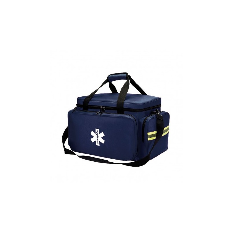 Botiquín vacío. Gran capacidad. Múltiples compartimientos reorganizables. Compartimientos elásticos para instrumentos. Durable y resistente a la humedad. Línea reflejante en los costados.
