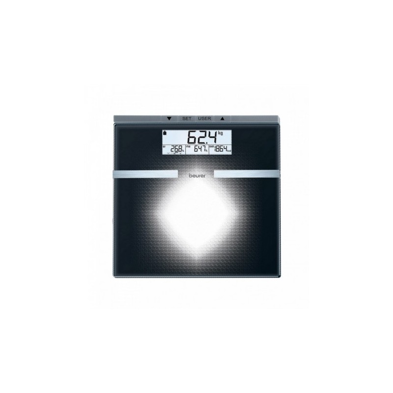 Báscula de diagnóstico bioeléctrica, electrodos de acero inoxidable, mide masa muscular, masa osea y agua corporal. Esta báscula funciona según el principio A.I.B., el Análisis de la Impedancia Bioeléctrica.